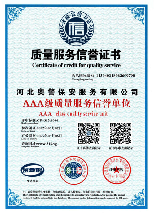 奧警邯鄲保安公司是一家民營保安服務(wù)公司,工商行政管理局登記注冊,獲取相關(guān)等級資質(zhì)證書,是一家大型的保安連鎖服務(wù)公司。